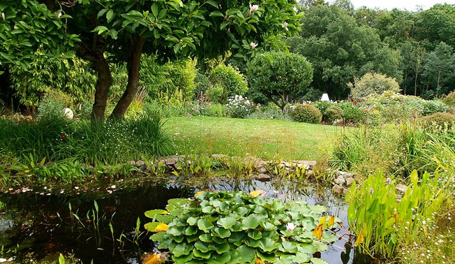Wildgarten mit exotischen Pflanzen, Teich und natürlichem Bach.
