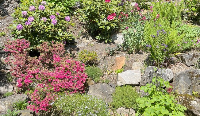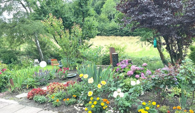 1961 entstand der gut 800 m² große Garten rund um mein Elternhaus am Hemberg. Frühe Erinnerungen sind viel Rasen, Obstbäume und ein Sandkasten sowie Rosen an der Terrasse. Später wuchs der Nutzgartenanteil mit Kartoffeln oder Buschbohnen sowie Beerensträuchern für die Saftherstellung. In den 80ern entstanden ein großzügiger Steingarten („Alpinum“) mit 4,5 Tonnen Natursteinbrocken im Osten und drei Betonmauern zur Terrassierung mit Gehölzen im Süden. 2022 übernahmen mein Mann Jürgen und ich das Grundstück und wir verfolgen seitdem die Idee eines insektenfreundlichen Gartens, in welchem wir den Lauf der Sonne vom Auf- bis zum Untergang verfolgen können. Viele typische Elemente der 60er haben wir behalten, aber alles bunter, vielfältiger und spielerischer gestaltet. Die Entwicklung des Gartens haben wir fotografisch festgehalten und präsentieren die Fotos an ausgewählten Standorten.