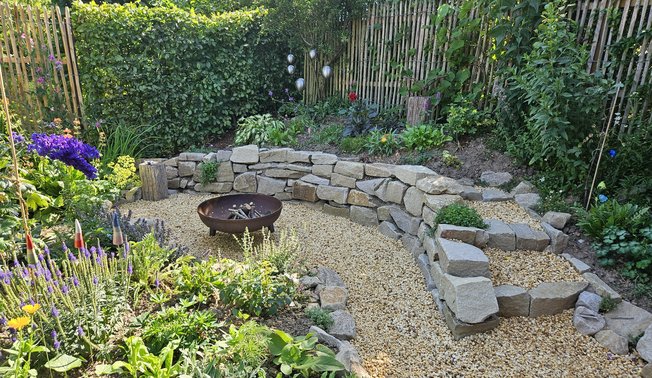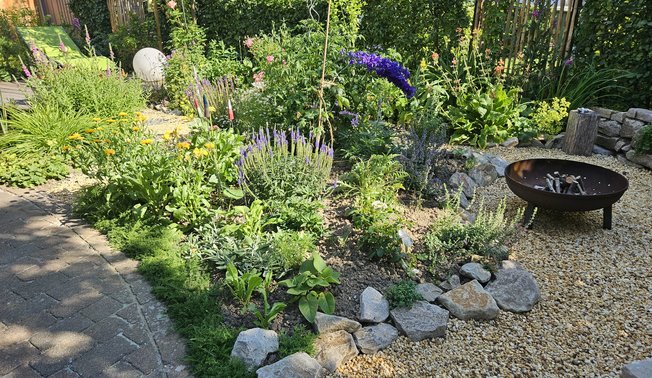 Eine Gartenfläche, die nur ca. 130 qm groß ist, wurde zu einem naturnahen, insektenfreundlichen Garten umgestaltet. Hier finden sich viele Pflanzen aus unterschiedlichen Lebensbereichen, die zahlreiche Insekten und Schmetterlinge anlocken: In Beeten in sonniger und schattiger Lage, auf Bruchsteinmauern oder am kleinen Teich. Im letzten Jahr wurde der Garten um einige Elemente ergänzt, z.B. wurde die kleine Rasenfläche in ein buntes Staudenbeet umgestaltet, Wege wurden strukturiert und eine neue Bruchsteinmauer umgrenzt eine Feuerstelle. Neu sind auch ein Futterhaus für Igel sowie ein Winterschlafhaus für Igel. Zu Beidem gibt es vor Ort Infos zur Umsetzung in ihrem Garten. - Ein Garten zum Entdecken.