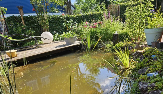Ein Wassergarten zum Anfassen, Fühlen, Riechen und Entspannen mit lebendigem Wasser, einem Rosengarten und einer Sonnenterrasse mit Grillecke.